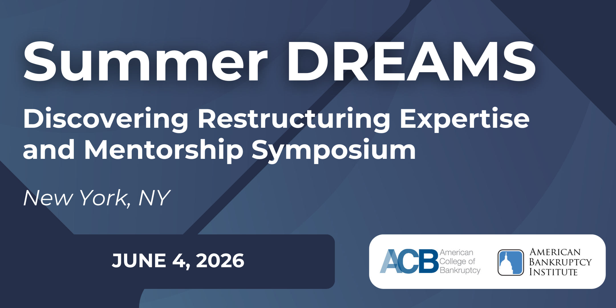 We are pleased to invite you to the inaugural Summer DREAMS event to be held in New York on June 4, 2026. Presented in collaboration with the American Bankruptcy Institute, this event features well-known jurists, professors and practitioners in the insolvency field. The program informs law students about careers in the insolvency field and features dialogue among members of the professional community. Space is limited - please register below!